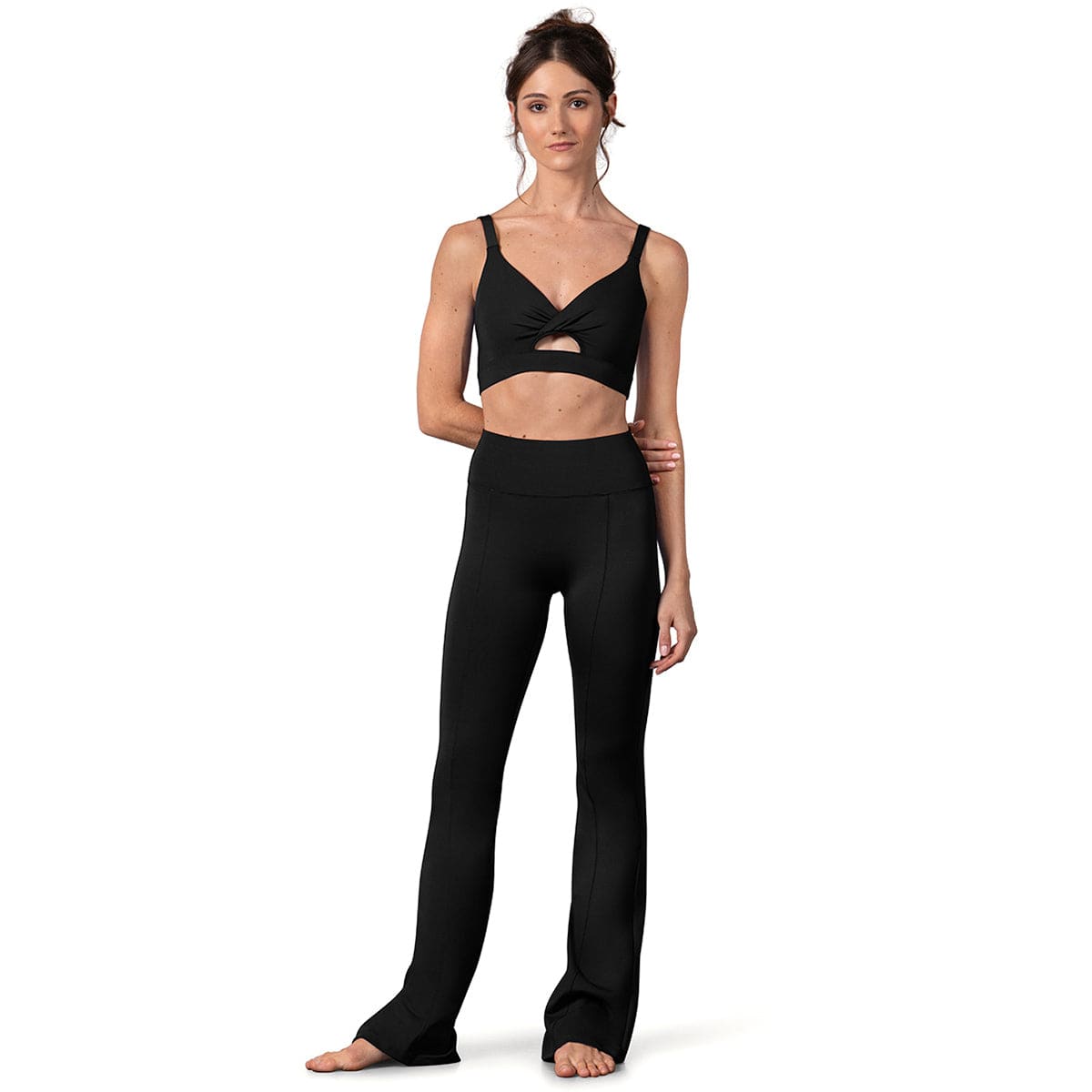 This eye-catching bra top features a flattering low V-neckline with a twist-front detail and a stylish notch cut-out that adds a contemporary edge to your dancewear look.