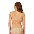 This bra features a simple front clasp and clear back strap for discreet support. It includes both clear and dyed-to-match bra straps that adjust and transition between three back neckline positions for different looks and functional support.