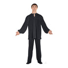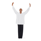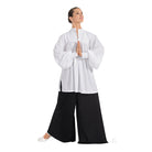 Unisex polyester open collar peasant style top with side slits.