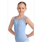 The Mirella Girls Kaleidoscope Tank Leotard features a delicately scooped soft mesh back and tank straps with printed kaleidoscope detail.